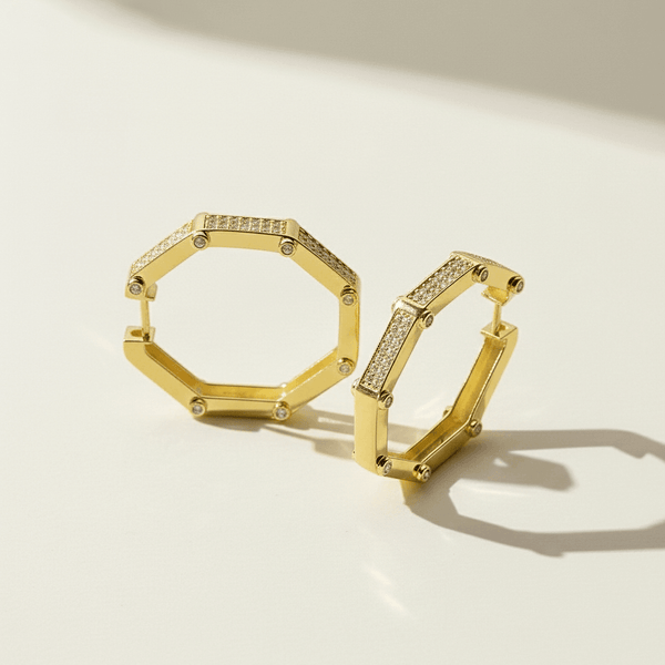 Capture attention with these octagonal hoops in yellow or white gold-plated finishes. The geometric shape delivers trendy style with its clean lines and reflective surfaces that catch the light beautifully. Wear them solo for maximum impact or stack them for layered flair. Fun, modern, and ready to make your ears the main event.