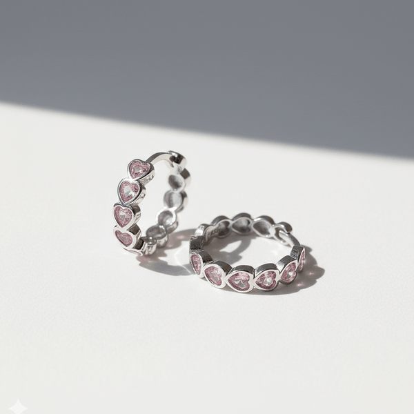 Blush pink crystal hearts rest securely in protective bezel settings, bringing you instant sparkle with every wear of these huggie hoops. These earrings work beautifully on their own or paired with your favorite studs for a layered effect. The bright rhodium finish pairs seamlessly with any aesthetic, from casual to glam. Perfect for anyone who loves a hint of romance with their sparkle.
