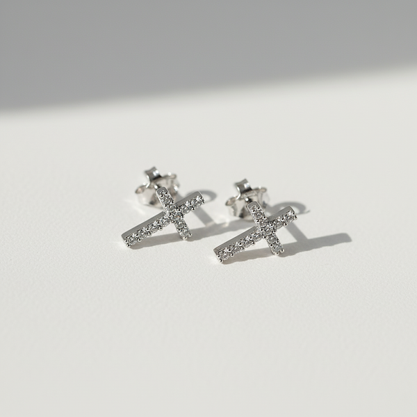 Add some divine sparkle to your style with these rhodium plated silver cross stud earrings featuring CZ stones. Perfect for any occasion, these earrings are sure to complement any outfit and make a statement with their holy design. A stylish way to show off your faith (and your fashion sense)!